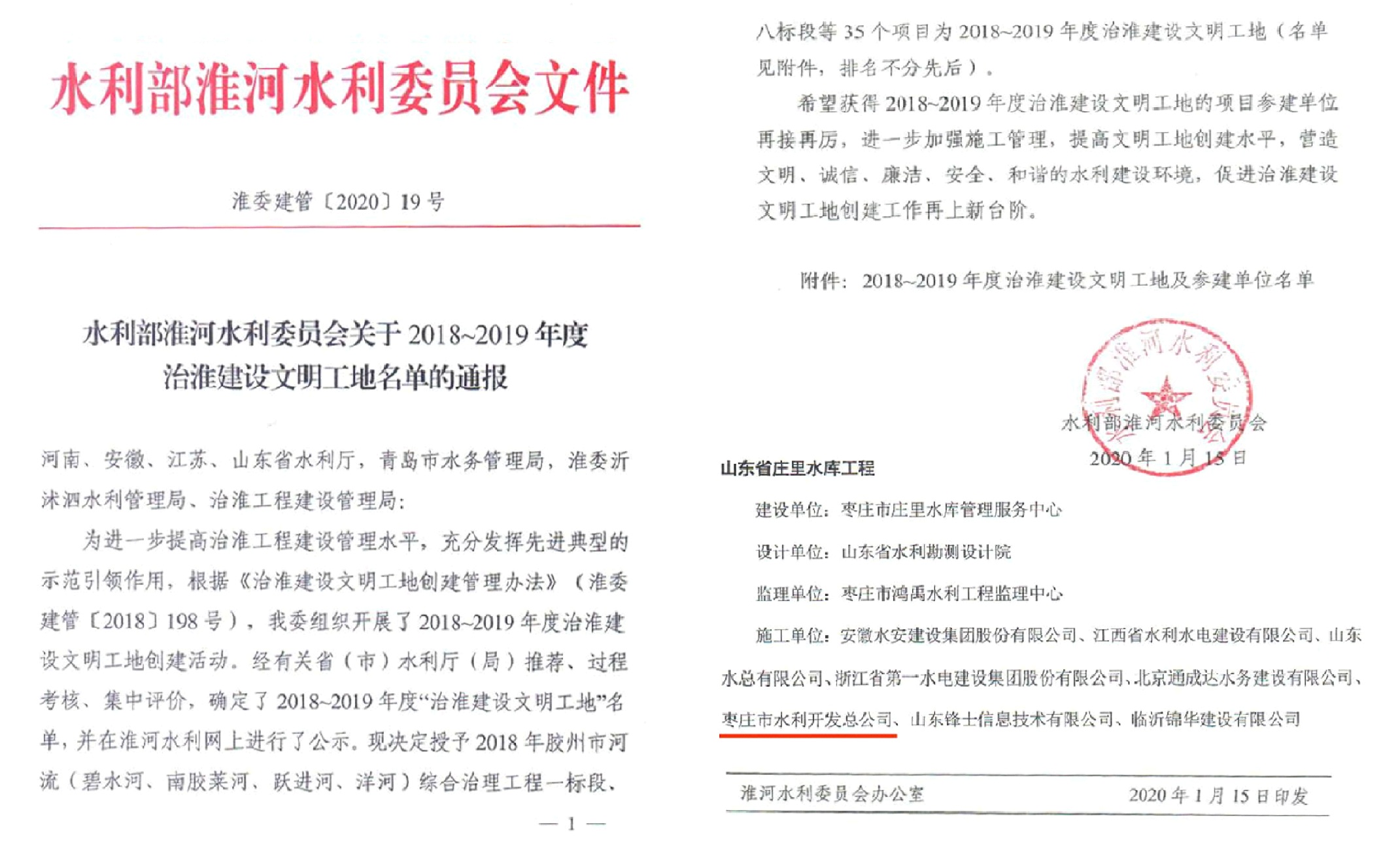 為進(jìn)一步提高治準(zhǔn)工程建設(shè)管理水平,充分發(fā)揮先進(jìn)典型的示范引領(lǐng)作用,水利部淮河水利委員會根據(jù)《治淮建設(shè)文明工地創(chuàng)建管理辦法》(淮委建管〔2018]198號)開展了2018~2019年度治準(zhǔn)建設(shè)文明工地創(chuàng)建評選活動。我公司參建的山東省莊里水庫工程,被評為2018-2019年度“治準(zhǔn)建設(shè)文明工地”。