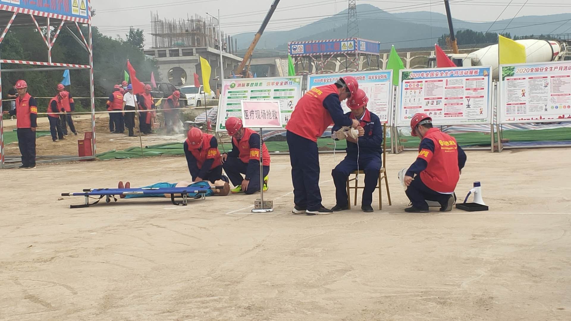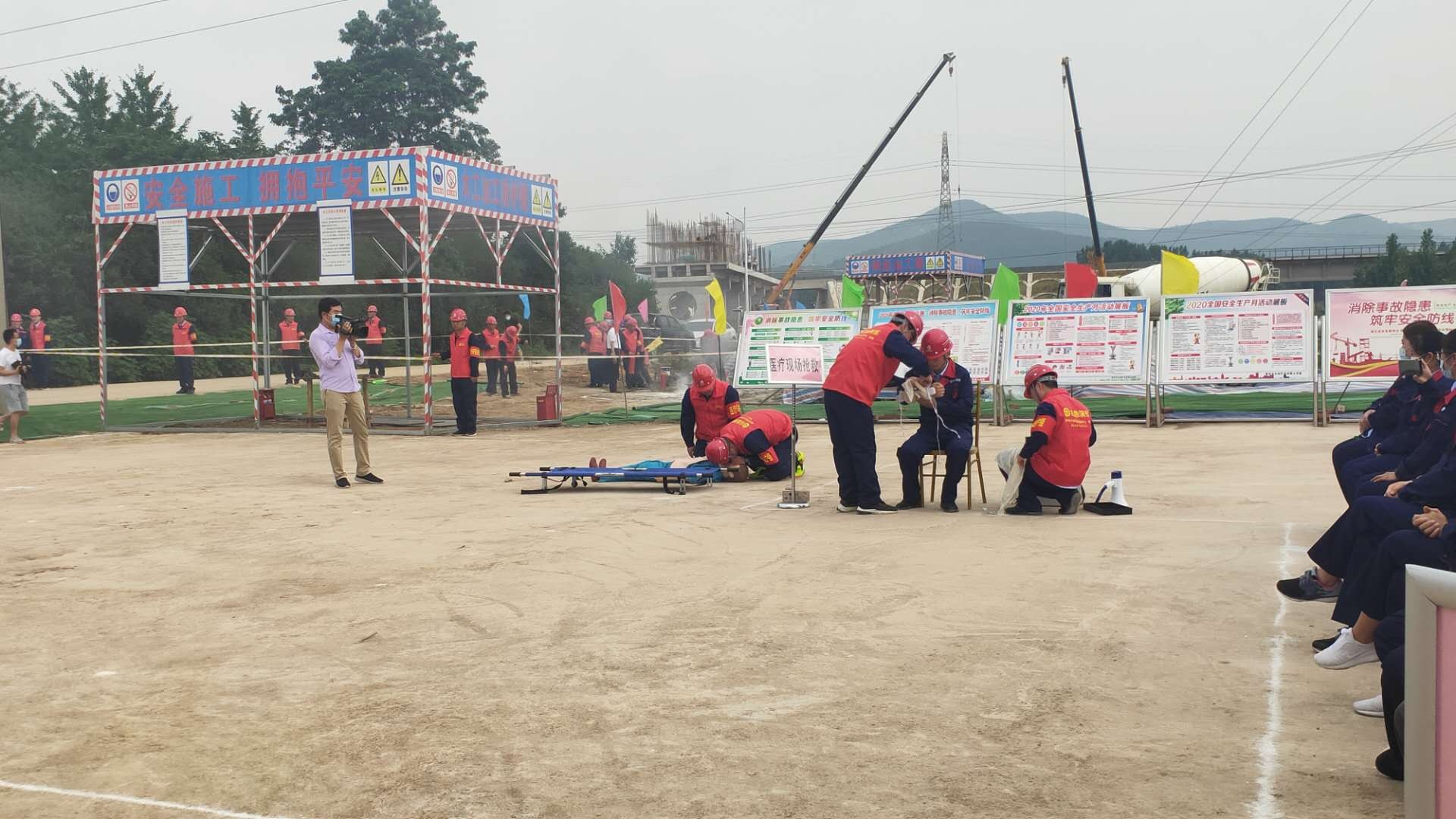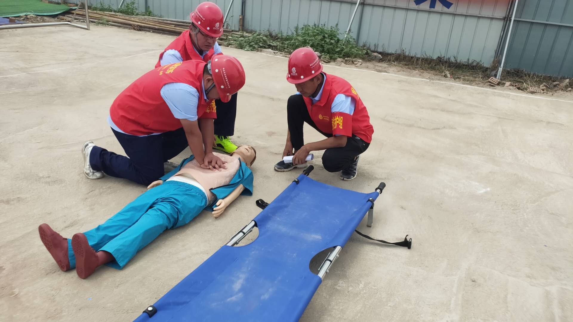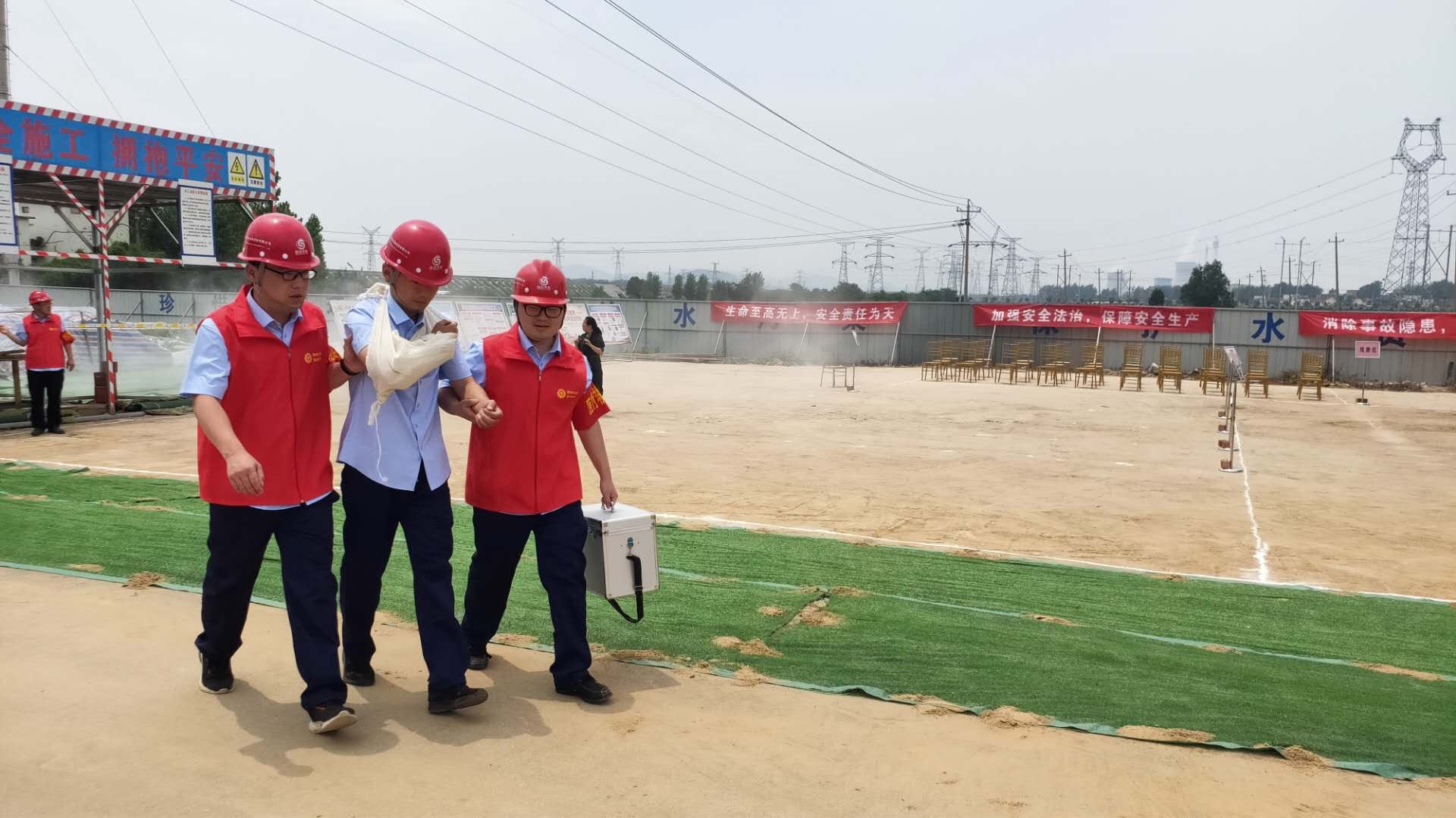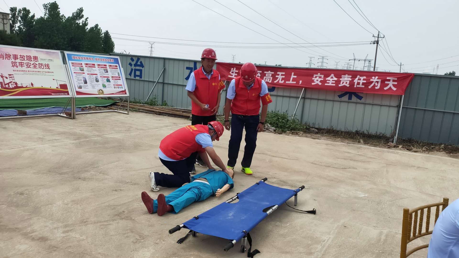 本次演練模擬事故情形為:市中區(qū)東王莊閘除險加固工程施工現(xiàn)場,模板加工廠電線線路短路引發(fā)火災,員工在實施初級滅火救援中1人不慎觸電,1人在施救時受到機械傷害,公司啟動《棗莊市水利開發(fā)有限公司生產(chǎn)安全事故綜合應急預案》一級響應。成立現(xiàn)場指揮部,指揮各救援職能組應急救援隊伍進行快速、準確的滅火救援,對傷者進行CPR及止血、包扎、固定、搬運等救護技能操作,在各救援職能組的全力配合下,圓滿完成此次應急救援任務。